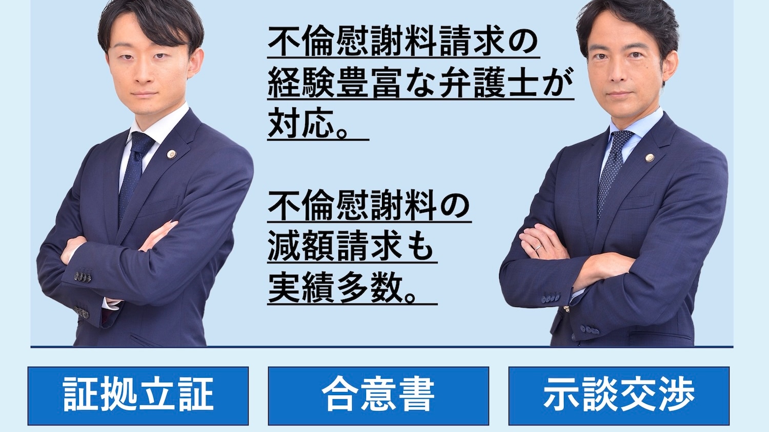 特に浮気・不倫慰謝料請求に関しては、さまざまな事案のお問い合わせ実績を誇ります。離婚問題に関しても、子どもの親権、養育費、財産分与、DVなど、多岐にわたる悩みに対応しています。この分野に力を入れている弁護士が相談から解決まで、丁寧に適切に対応いたします。