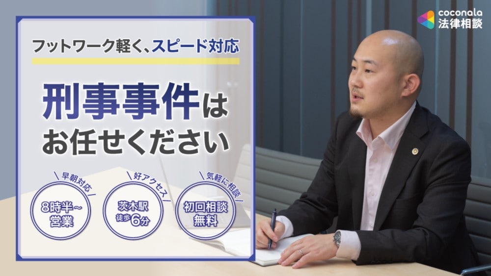 【茨木駅徒歩6分】【初回電話相談無料】【スピード対応】根気強い主張と地道な交渉が強みです!性犯罪/窃盗罪/薬物事件など幅広く対応。「まず何から解決すべきか分からない」という方も、お気軽にご相談ください【朝8:30から営業】【電話相談可】