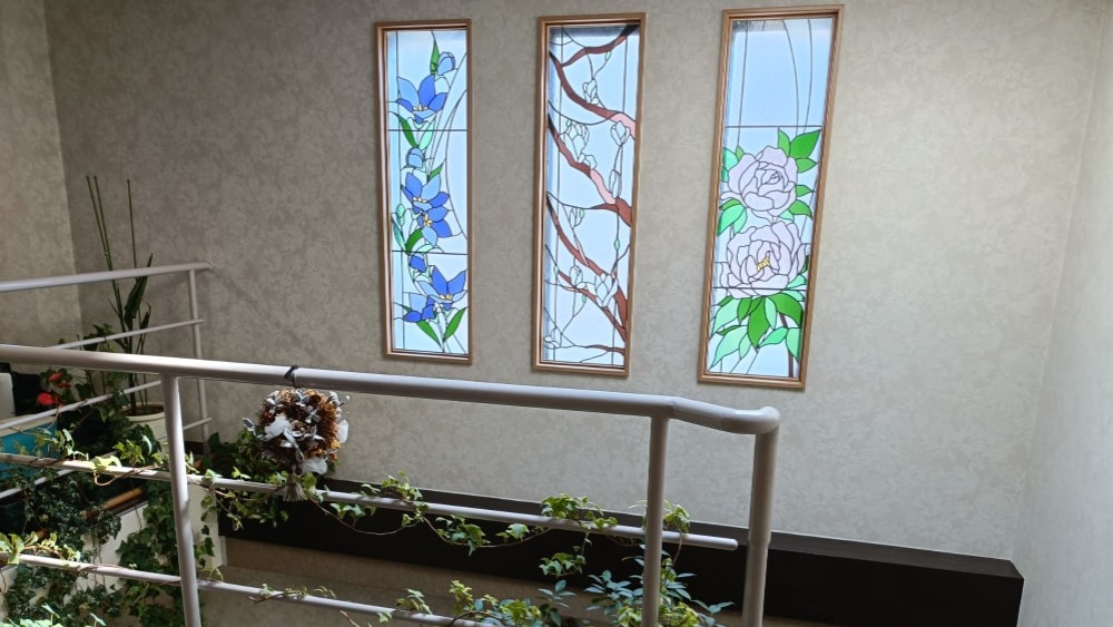 - 花と緑が多い事務所で、吹き抜けのステンドグラスの写真です。