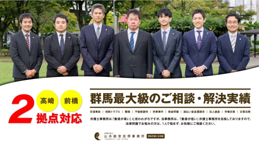 弁護士法人山本総合法律事務所は、交通事故被害、債務整理、遺産相続、離婚・慰謝料トラブル、労災・刑事弁護等、群馬県にお住いの多くの皆さまの法律トラブルに積極的に取り組んでおります。